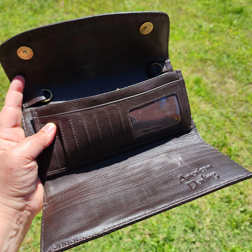 This great sunflower wallet can be used so many ways and you can carry it as a wallet or a crossbody as it comes with a removable strap. Lots of compartments add so much room in this beautiful leather wallet.Â