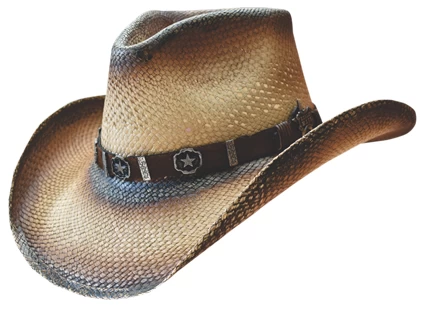 This fashionable straw hat is tea stained with a special Texas Star accents on a brown leather hatband. It is perfect for dressing up for a night out.Â