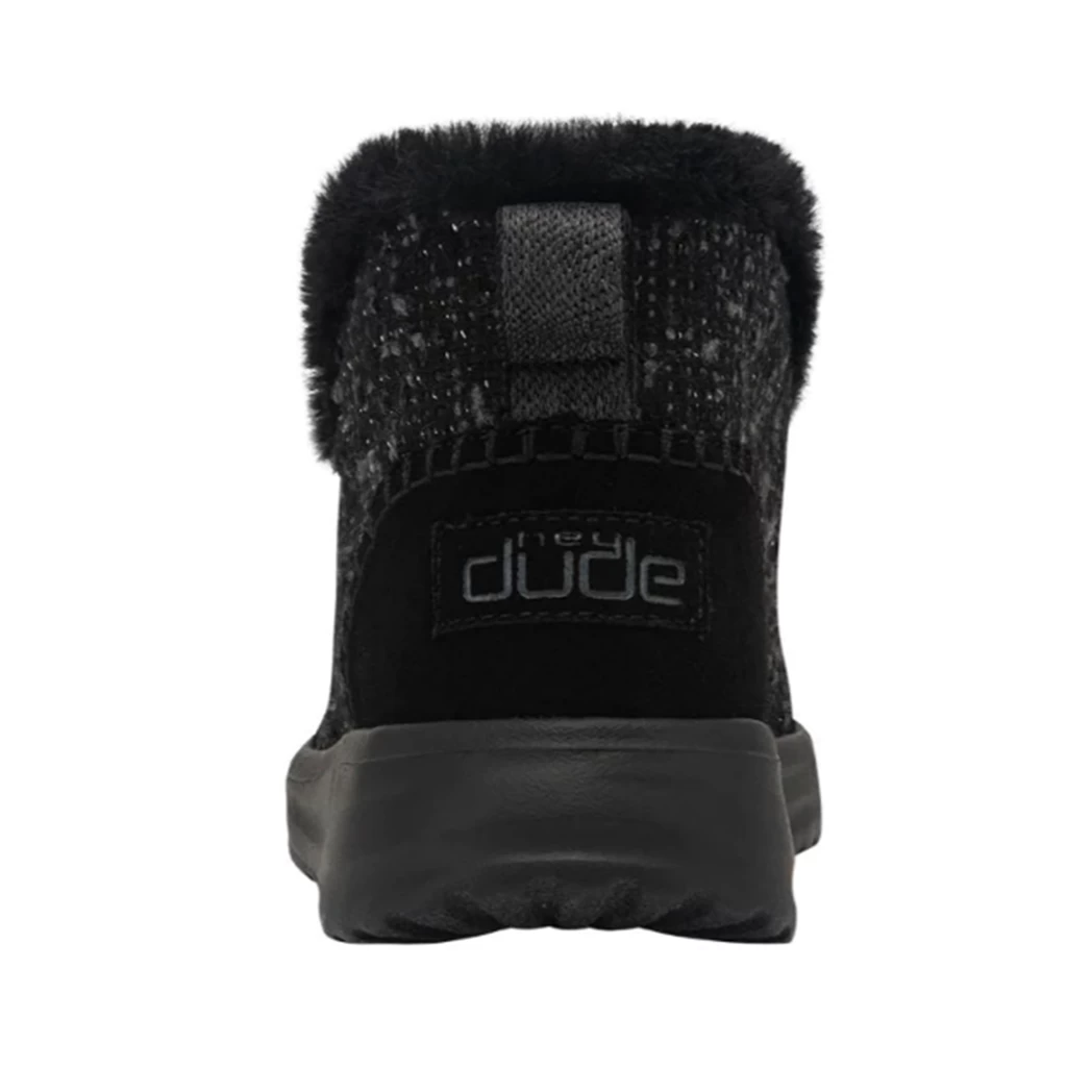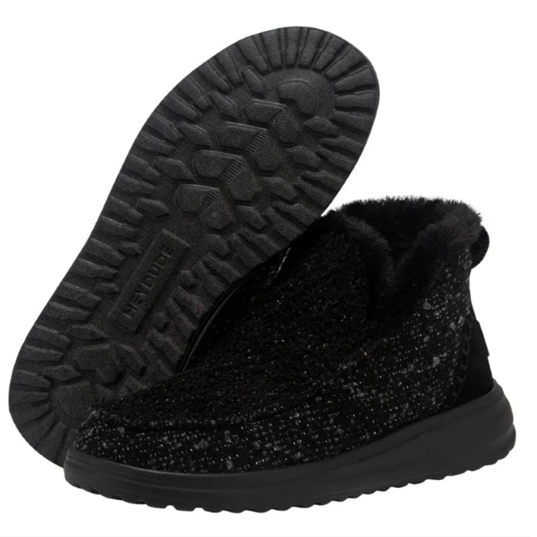 Slip into this ultra comfy Denny Sparkling Black moccasin-inspired bootie from Hey Dude! A soft, subtle bootie constructed in a soft wool blend with plush faux fur lining to keep your feet warm and dry all winter long. Finished off with contrasting, hand-stitched details and glitter-woven finishes throughout.Â