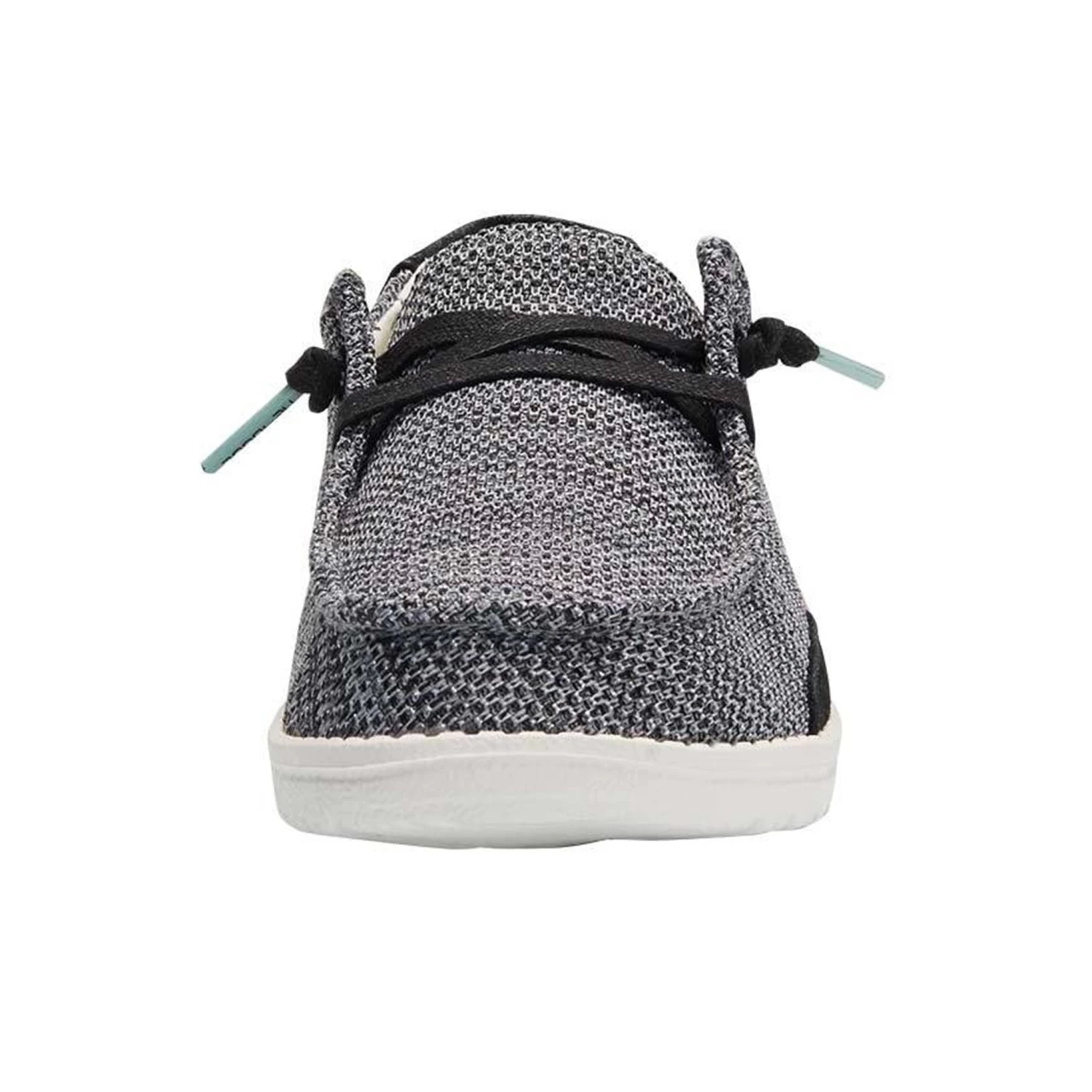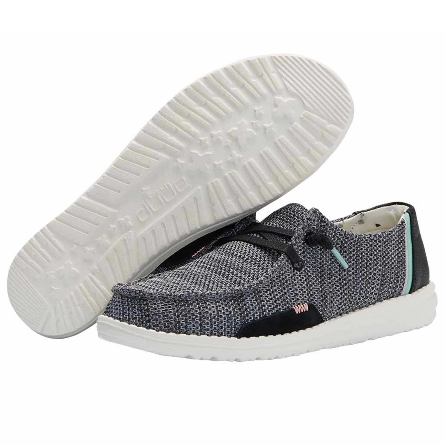 This pair of Hey dudes is different and unique. They feature a unique black sparkle to them with a shiny solid black heel. They also include a light pink and turquoise color to them. Â