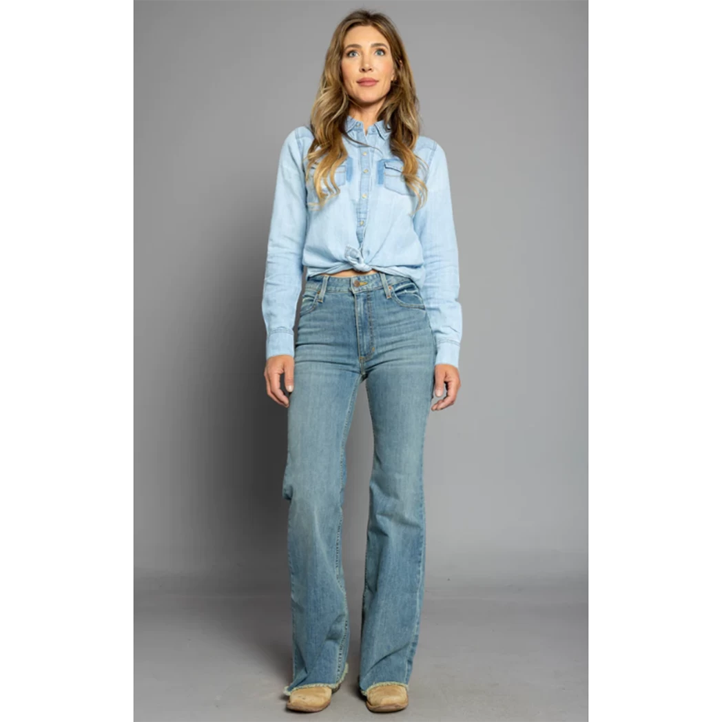 The Kimes Olivia is a a high-rise, stovepipe jean with a wide leg and raw hem! This stylish Jean is like no other, premium denim, the olivia jean holds it’s shape and gives a beautiful silhouette. Made from Kimes innovative tri-blend denim for maximum wearability and rebound, this lightweight jean is accented with the Kimes iconic Longhorn logo on both back pockets.